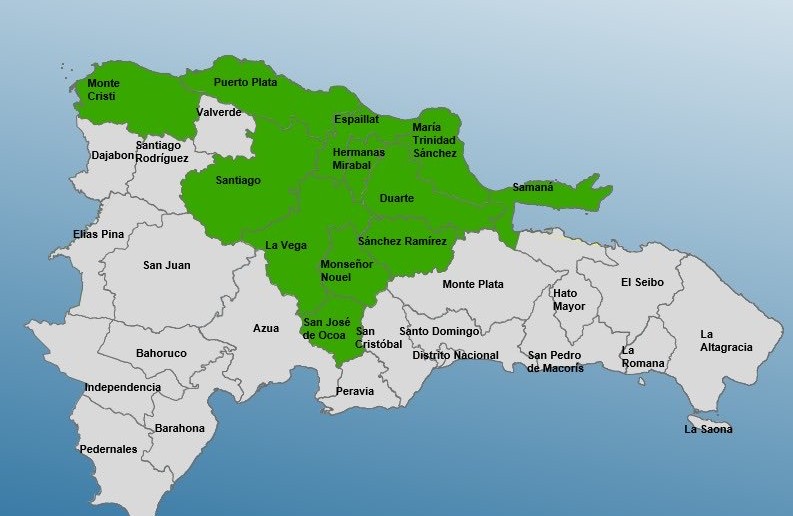 Un comunicado de prensa enviado este medio detalla que las provincias en alerta son Espaillat, Samaná, Hermanas Mirabal, Montecristi, María Trinidad Sánchez, Monseñor Nouel, La Vega, San José de Ocoa, Duarte, Santiago, Puerto Plata y Sánchez Ramírez.