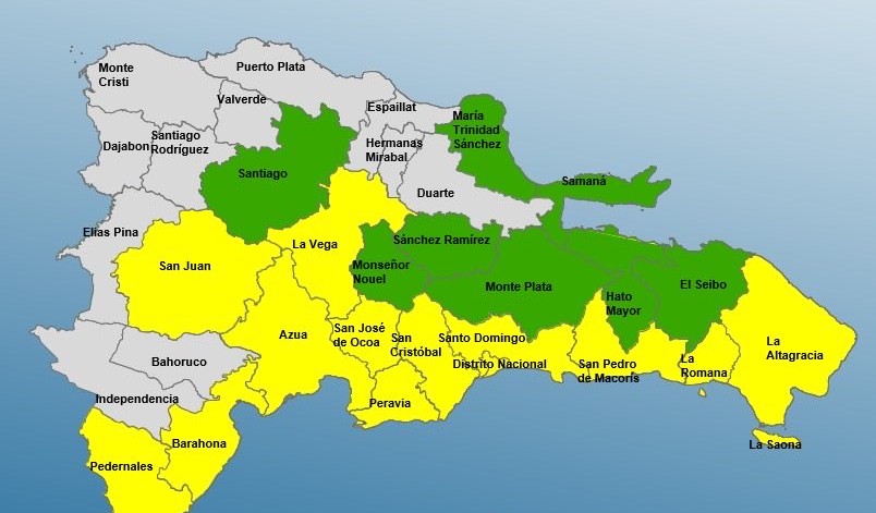 De esta forma las provincias en alerta amarilla son: La Vega, San Pedro de Macorís, San Juan, San Cristóbal, San José de Ocoa, Pedernales, Santo Domingo, Peravia, Azua, Distrito Nacional, La Altagracia, Barahona y La Romana.
