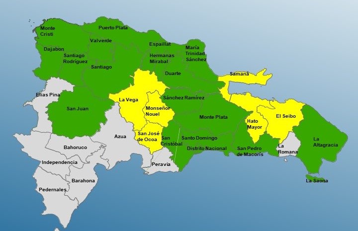 En tanto, colocó en verde (mínima) a Santo Domingo, el Distrito Nacional, La Altagracia, San Pedro de Macorís, Monte Plata, San Cristóbal, Sánchez Ramírez, Duarte, María Trinidad Sánchez, Espaillat, Hermanas Mirabal, San Juan, Santiago, Santiago Rodríguez, Dajabón, Montecristi, Valverde y Puerto Plata.