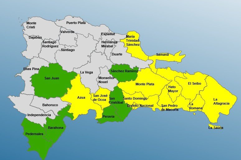 En tanto, en alerta verde están San Juan, Barahona, San Cristóbal, Pedernales, San Juan y Sánchez Ramírez.