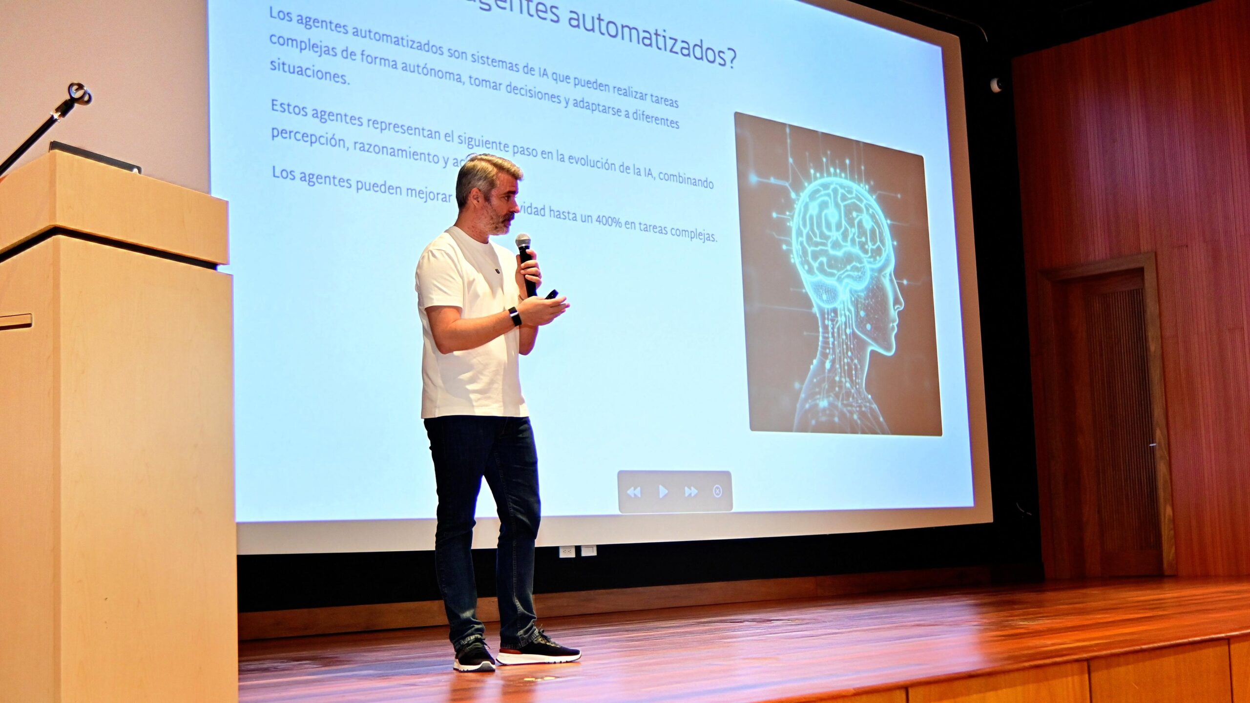Por su parte, José Villalobos consultor de negocios, tecnología e inteligencia artificial, considera que estamos frente a una era de la revolución de la productividad y mostró como podemos usar la IA desde los distintos ámbitos de la empresa, para optimizar, ser más efectivos y poder ahorrar horas de trabajo semanales por persona.